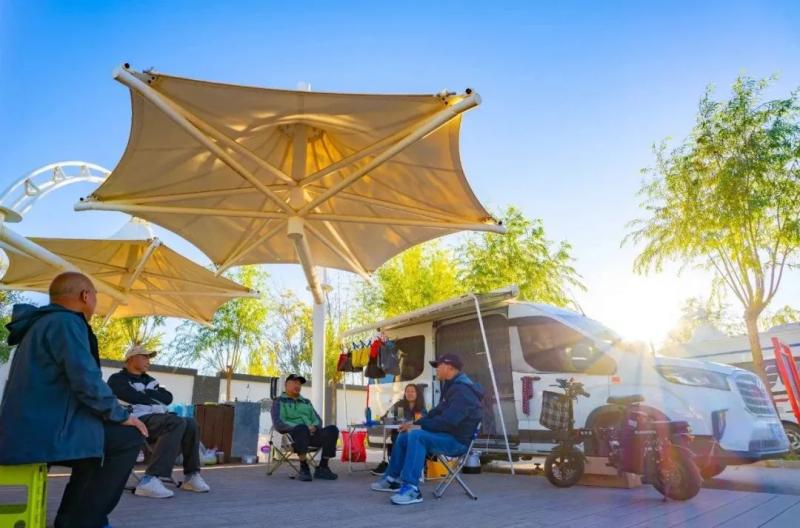 在額濟納旗居延驛站,不少自駕游旅客搭起帳篷、支起飯桌,三五好友圍坐在一起,盡情探索“露營+”新玩法。旅游旺季期間,居延驛站全力保障車位供給,配備完善的水電系統(tǒng),著力提升游客體驗感?!斑@里不僅風光獨特,而且旅游設(shè)施完善、服務(wù)周到,真是不虛此行?!眮碜陨虾5摹澳β冒l(fā)燒友”云楓連連稱贊。
