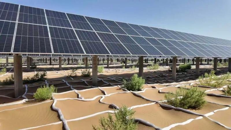 在內(nèi)蒙古華電騰格里清潔能源外送基地,建成的200萬千瓦光伏項目正將清潔能源輸送入網(wǎng)。該項目因地制宜采用“光伏+治沙”的形式,通過板上發(fā)電、板下修復、板間種植,在治理沙地的同時促進節(jié)能降耗,實現(xiàn)生態(tài)、經(jīng)濟效益的有機統(tǒng)一。