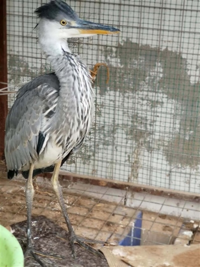 經(jīng)有經(jīng)驗(yàn)的民警辨認(rèn),這是一只蒼鷺幼鳥。這只鳥身高約70公分,長(zhǎng)長(zhǎng)的尖嘴,身著灰色體羽,頭戴深灰色羽冠,兩條大長(zhǎng)腿格外顯眼,白色的前頸縱向排列著黑灰色條紋。民警聯(lián)系獸醫(yī)為其做了體檢,經(jīng)檢查,這只鳥并無(wú)傷病,可能是由于剛出窩飛行能力不強(qiáng)、捕食能力不足,造成體力虛弱。民警買來(lái)小魚,只見這只鳥狼吞虎咽享用起來(lái),不久便精神十足,開始啄民警??吹剿w力開始恢復(fù),民警懸著的心也就放下了。民警計(jì)劃選擇合適時(shí)間和地方將其放飛。
