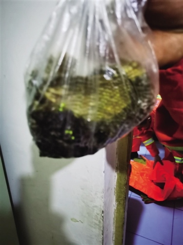 社區(qū)居委會(huì)王主任獲悉這一情況后,立即與正翔國(guó)際消防站取得聯(lián)系,并與4名消防員一同趕往現(xiàn)場(chǎng)查看。經(jīng)過(guò)勘查,馬蜂窩直徑約20厘米,筑在居民樓2樓的玻璃窗下面,周?chē)胁簧亳R蜂飛來(lái)飛去,嚴(yán)重干擾該住戶的正常生活。消防隊(duì)員通過(guò)仔細(xì)觀察,快速制定了摘除方案。一名隊(duì)員穿著防蜂服,做好安全防護(hù)工作,先用殺蟲(chóng)劑對(duì)馬蜂窩周?chē)鸟R蜂進(jìn)行驅(qū)趕,然后小心翼翼地用塑料袋套裝整個(gè)蜂窩。經(jīng)過(guò)消防隊(duì)員十多分鐘的努力,蜂窩被成功摘除,為防止馬蜂再次筑巢,隊(duì)員還對(duì)蜂窩進(jìn)行了徹底清理。