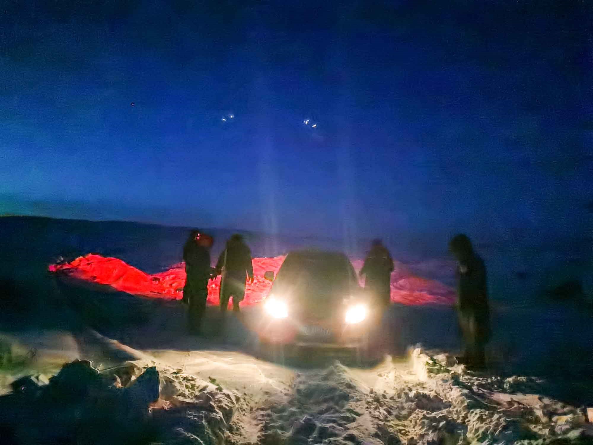 1月17日17時(shí),那木吉拉與弟弟一同駕車返回百靈廟鎮(zhèn),在途經(jīng)一處被風(fēng)谷地時(shí),由于晚上視線較差,且此處坡度較大,不慎陷入雪中無法動(dòng)彈,只得撥通電話請(qǐng)求派出所救助。草原上沒有遮蔽物,常常到了下午就刮起大風(fēng),吹得積雪覆蓋在土地上分不清地勢(shì)高低,民警們按著平日下鄉(xiāng)走訪的經(jīng)驗(yàn)摸索前進(jìn),經(jīng)過近一小時(shí)才到達(dá)現(xiàn)場,了解情況后,民警們將準(zhǔn)備好的熱水和棉大衣遞給牧民便展開了救援工作。在零下35度的冬夜里,民警們用鐵鍬和雙手經(jīng)過近兩個(gè)小時(shí)的奮戰(zhàn)終于將40厘米厚的積雪清理干凈,并將被困車輛通過前拉后推的方式移至平坦區(qū)域。