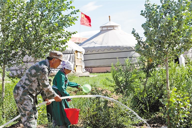 夏日清晨一大早,太陽才露頭,位于中蒙邊境的阿巴嘎旗巴彥圖嘎蘇木巴彥圖呼木嘎查錫林老兵村主任張進(jìn)祥,正在與老鄰居蘇都斯琴往車上搬運(yùn)床架子和厚實(shí)的床墊。不僅如此,不久前,已經(jīng)搬遷到外地居住的貧困戶明干其其格家要通網(wǎng)電,這一惠民之舉對于周邊的牧民們來說可是盼望已久的大好事,張進(jìn)祥不僅一直幫其照看房子,還東奔西走地幫忙立電線桿、拉線、培土。張進(jìn)祥的妻子和兩個內(nèi)弟都是當(dāng)?shù)卮緲闵屏嫉拿晒抛迦?,他早就把自己的血肉、情感融入到了這片深愛的草原上。
