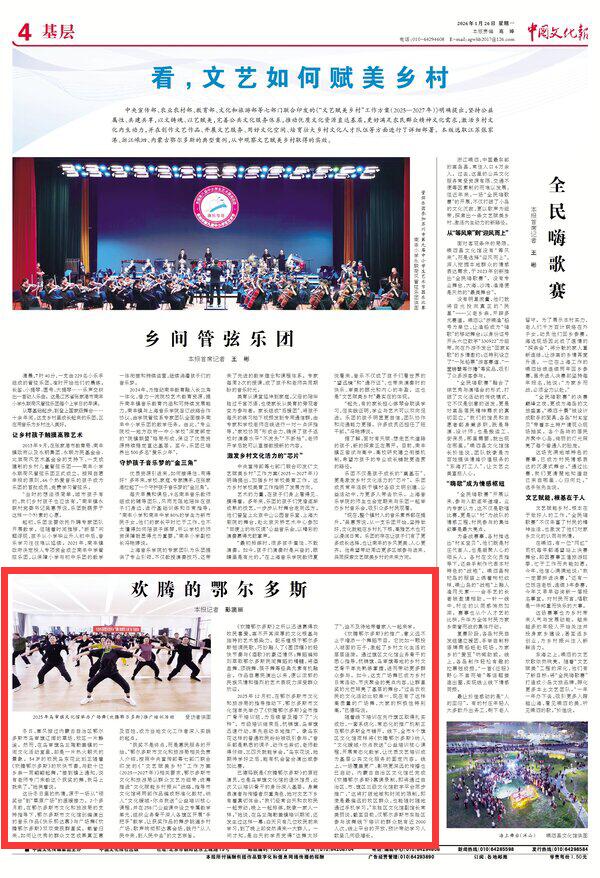 2026年1月26日《中國(guó)文化報(bào)》第4版刊發(fā)了《歡騰的鄂爾多斯》的文章,報(bào)道了廣場(chǎng)舞《歡騰鄂爾多斯》已成為鄉(xiāng)村日常活動(dòng)、節(jié)慶聚會(huì)的亮點(diǎn)內(nèi)容,讓群星獎(jiǎng)的光芒照亮了基層的舞臺(tái)。作品自惠民演出以來(lái),便以濃郁的民族風(fēng)情和強(qiáng)烈的藝術(shù)表現(xiàn)力深受群眾歡迎。
