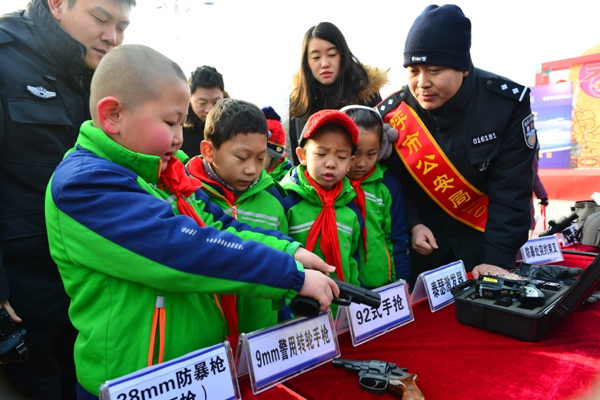 1月10日,民警為小朋友們講解槍支警械。當(dāng)日,是全國(guó)第33個(gè)“110宣傳日”,呼和浩特市公安局在如意廣場(chǎng)開展了“110宣傳日”活動(dòng)?,F(xiàn)場(chǎng),戰(zhàn)鷹突擊隊(duì)民警向市民介紹了槍支警械以及常用裝備,四旋翼無(wú)人機(jī)、定位儀、微光夜視儀等先進(jìn)設(shè)備。活動(dòng)讓群眾零距離接觸了難得一見的特種裝備,搭建起警民互動(dòng)橋梁,增強(qiáng)市民的安全感。