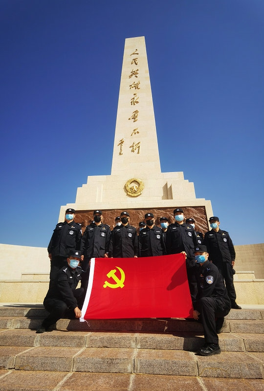 在紀念碑前,隊員們面對鮮紅的黨旗,高舉右手莊嚴宣誓。通過重溫入黨誓詞,進一步增強了黨員民警輔警的使命感、責任感和榮譽感,表達了對黨、對人民的無限忠誠和堅定信念。