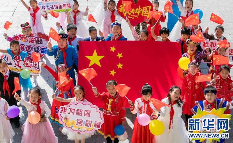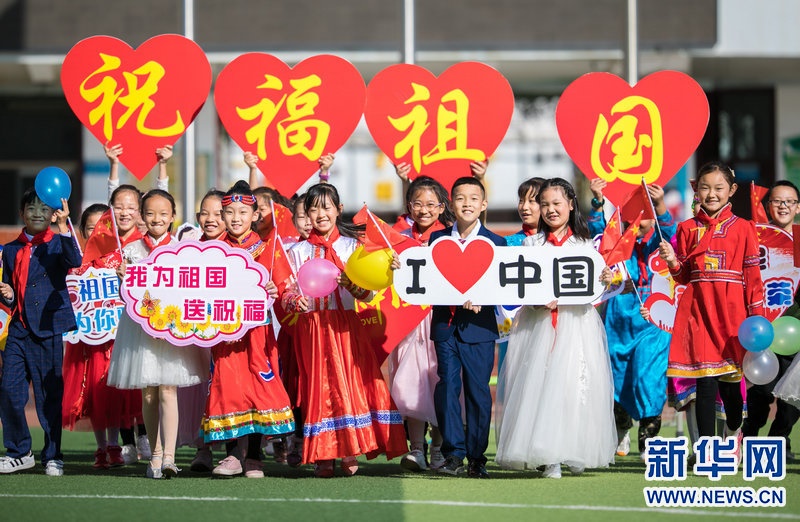9月29日,內(nèi)蒙古呼和浩特市玉泉區(qū)五塔寺東街小學(xué)學(xué)生在主題快閃活動上,祝福偉大祖國繁榮昌盛。新華網(wǎng)發(fā)(丁根厚攝)