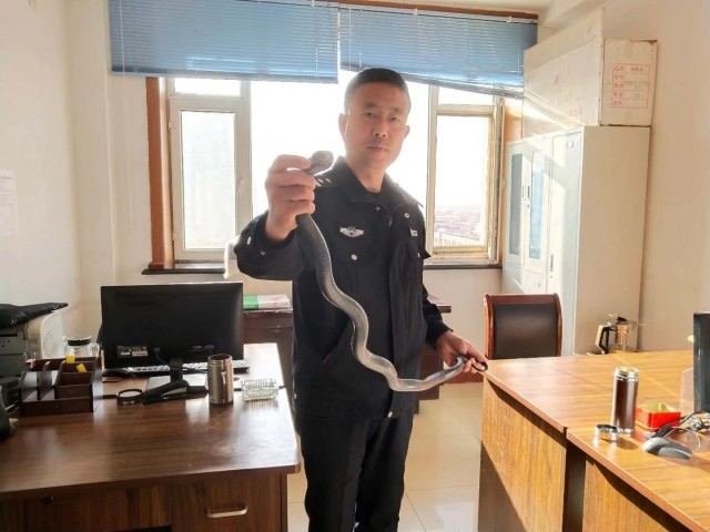 隨后,民警將這條蛇裝入塑料袋,并將其層層包裹,放入警車的后備箱內(nèi)。然而,不可思議的事情發(fā)生了。11月6日,當(dāng)民警打開警車,準(zhǔn)備將其送往呼和浩特市野生動(dòng)物園時(shí),發(fā)現(xiàn)這條蛇“逃逸”了,包裹其的塑料袋已被咬破。民警在警車內(nèi)四處尋找,卻未能找到它的蹤影。直到11月7日中午時(shí)分,民警終于在派出所的院內(nèi)發(fā)現(xiàn)了它的身影,這條黑王錦蛇正在院內(nèi)自由溜達(dá),曬著太陽。