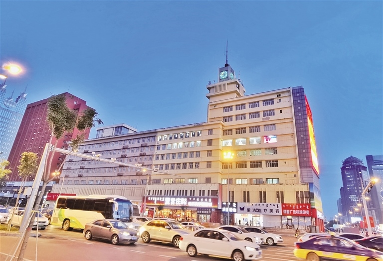 當(dāng)日傍晚時(shí)分,天色漸暗,華燈初上,在斑斕的霓虹燈中,街道車(chē)水馬龍,人群熙熙攘攘,一派繁華都市的景象。這座建于1983年的景觀塔鐘,依然和30多年前一樣屹立在新華廣場(chǎng)東側(cè)的信息大廈樓頂,再次以“地標(biāo)”姿態(tài)工作起來(lái)。