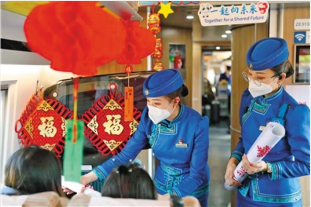 2022年2月15日,在包頭開往北京北的G2494次復(fù)興號列車上,高鐵乘務(wù)員與旅客們一起度過溫暖又美好的旅程。