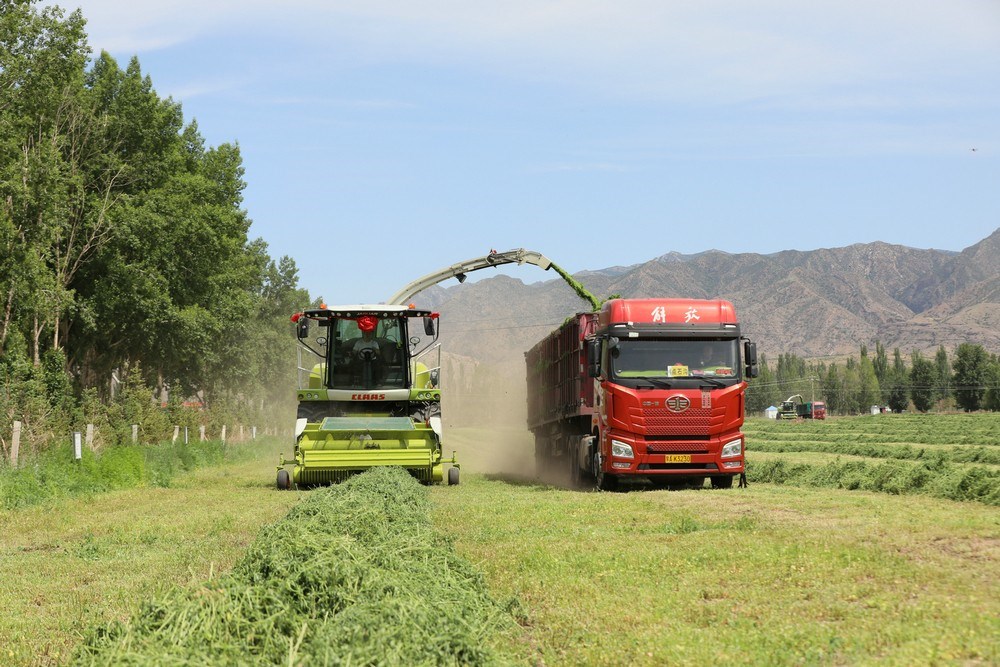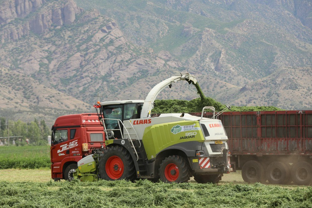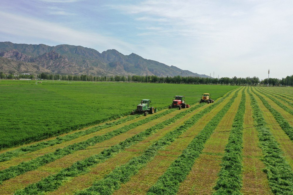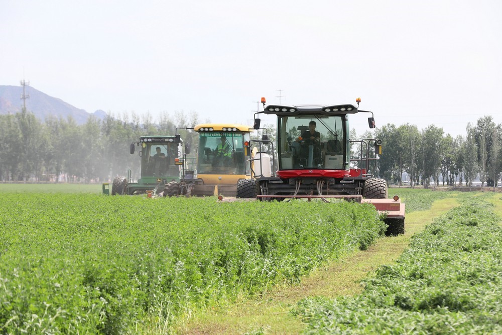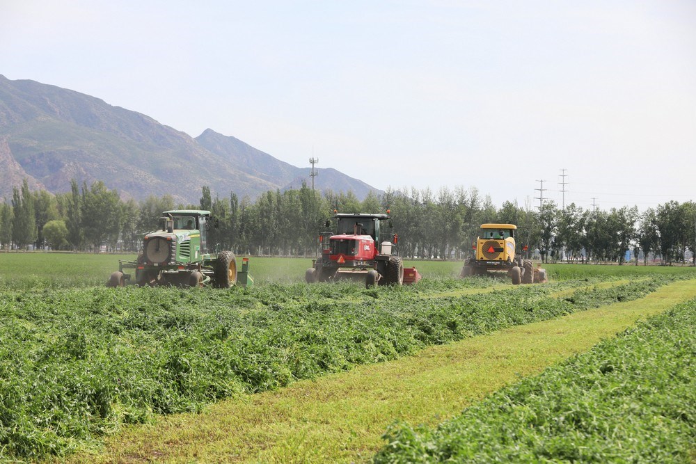 紫花苜蓿是多年生草本植物,因其產(chǎn)量高、生長周期短、再生能力強,是優(yōu)質(zhì)的高蛋白牧草。當天,收割令一下,3臺大型收割機械同時開動,如同巨輪駛?cè)刖G色海洋,場面壯觀。割下的紫花苜蓿就地晾曬,待苜蓿中水分含量下降后,再進行粉碎、裹包,然后進行貯存,提供給牧場作為青貯飼料。