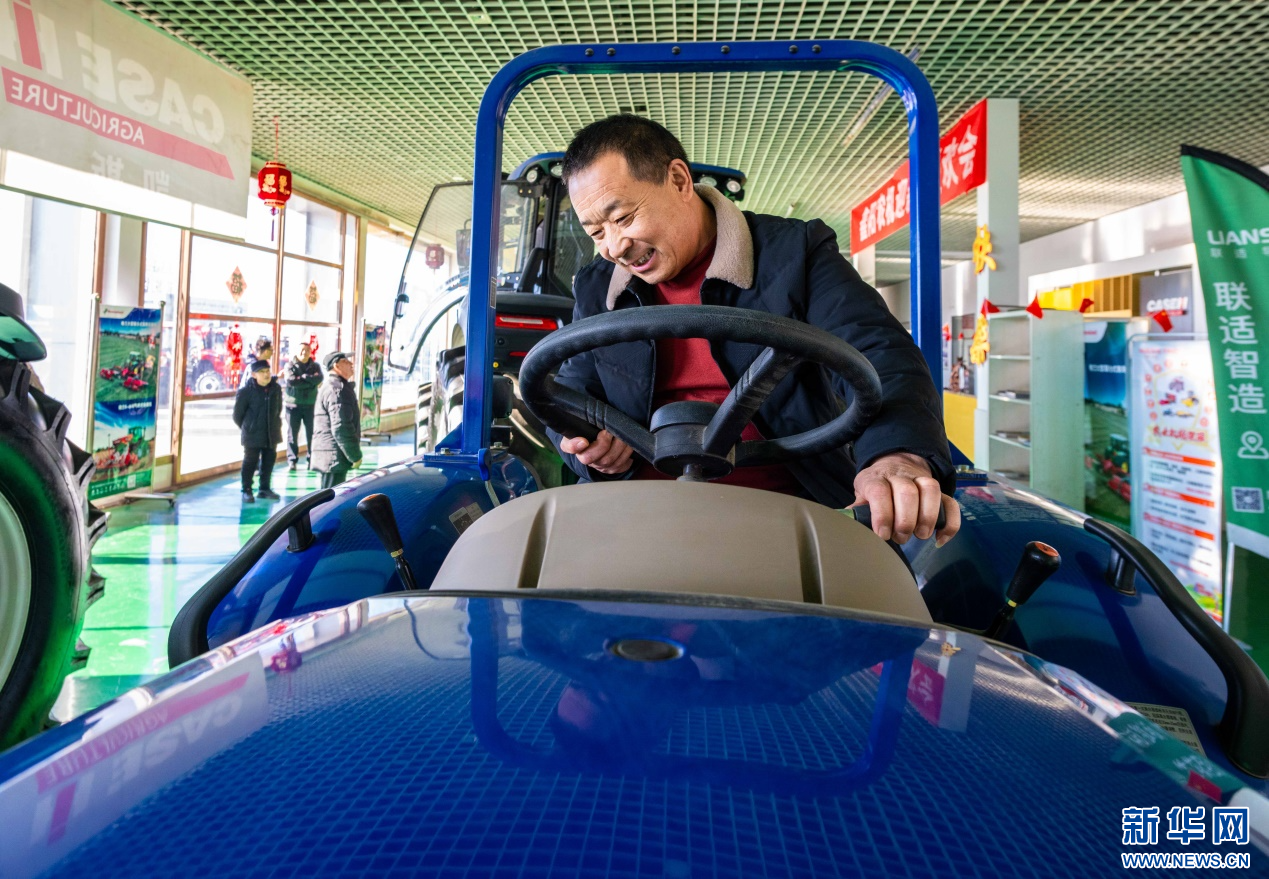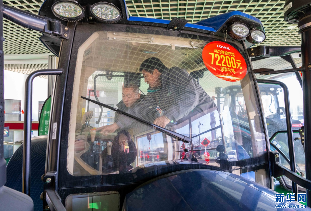 ??2月18日,在位于呼和浩特市玉泉區(qū)的一家農機設備公司展銷大廳,農戶在試駕拖拉機。新華網(wǎng)發(fā)(丁根厚 攝)