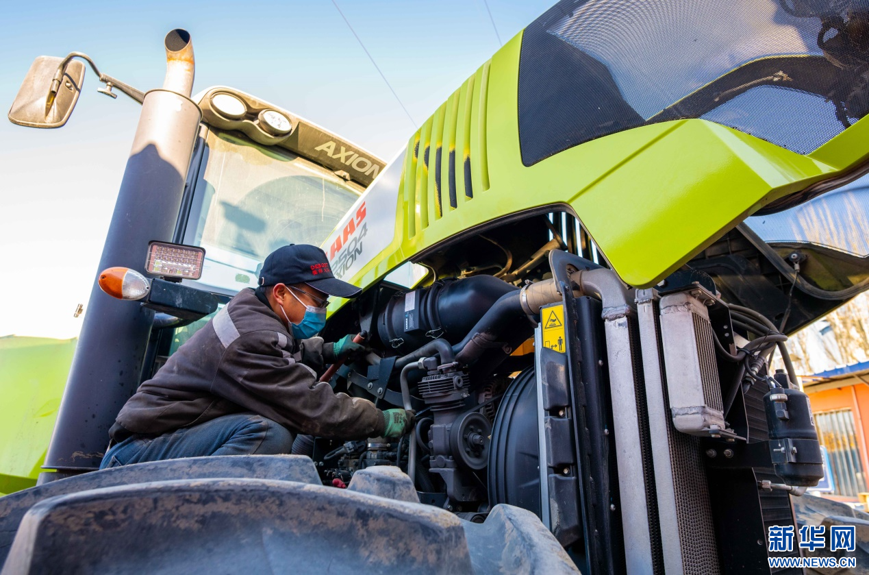 ??2月18日,在位于呼和浩特市玉泉區(qū)的一家農機設備公司農機具維修區(qū),工作人員在為當?shù)氐霓r戶檢修拖拉機。新華網(wǎng)發(fā)(丁根厚 攝)