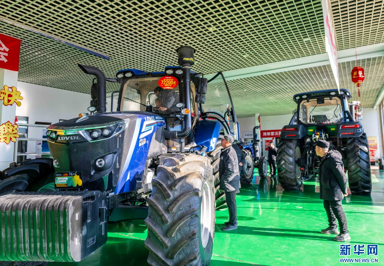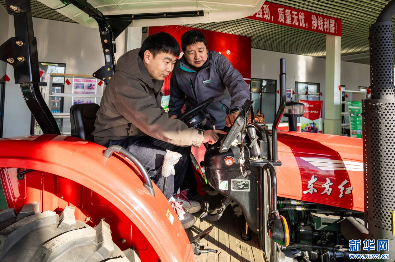 ??2月18日,在位于呼和浩特市玉泉區(qū)的一家農機設備公司展銷大廳,農戶在咨詢選購拖拉機。新華網(wǎng)發(fā)(丁根厚 攝)