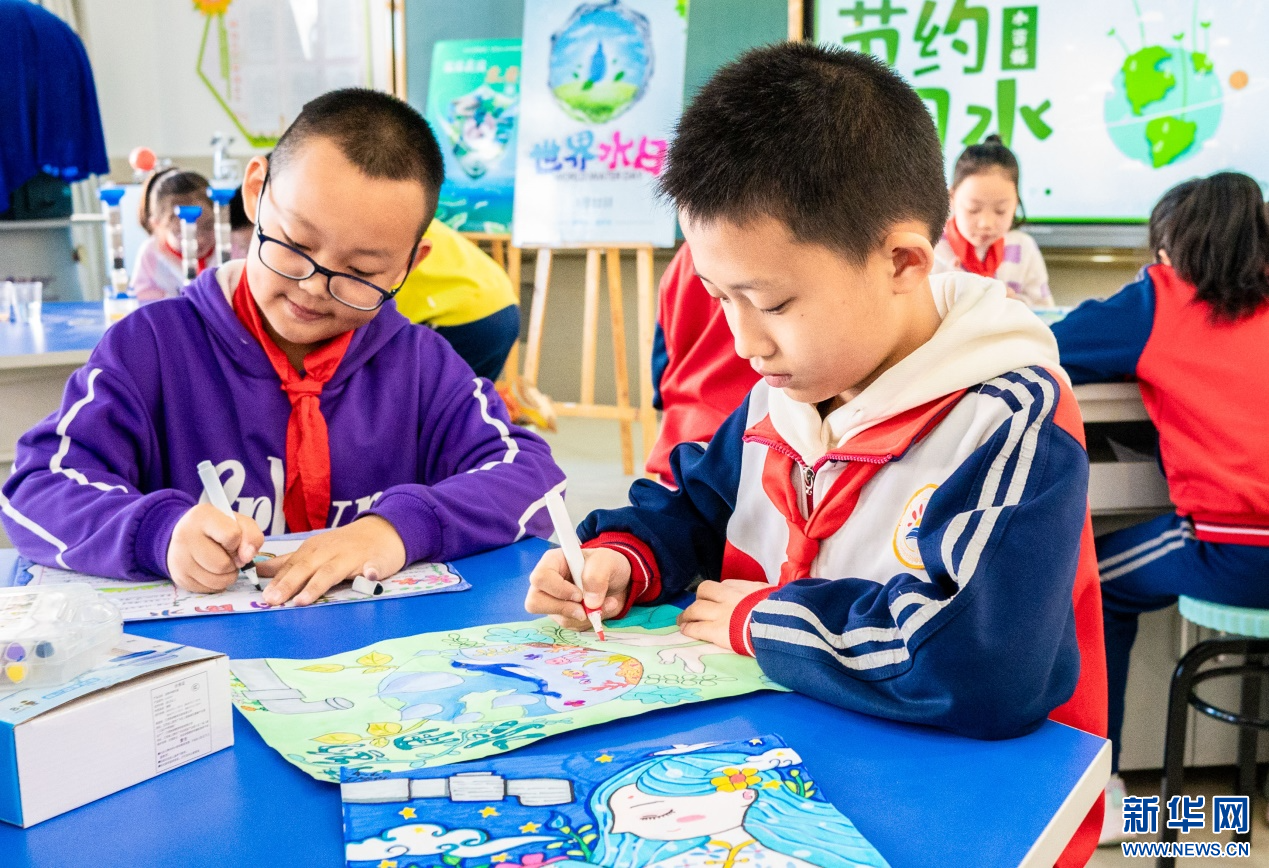 ??3月20日,呼和浩特市玉泉區(qū)石東路小學學生在繪制愛水護水兒童畫。新華網(wǎng)發(fā)(丁根厚 攝)