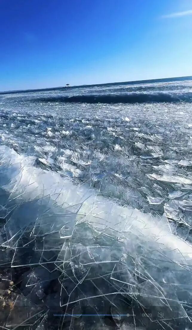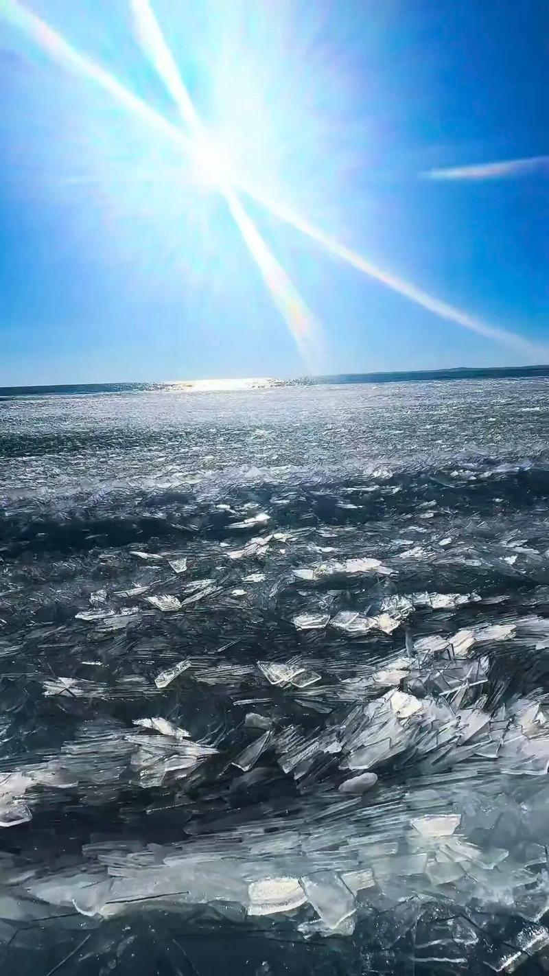 在無(wú)人機(jī)航拍視角下,2239.9平方公里的湖面上,冰排與未完全封凍的水域交織分布,白色冰體與湛藍(lán)湖水相映,宛如大地鋪展的巨型碧玉上鑲嵌的銀紋。靠近湖中心的區(qū)域,新凍結(jié)的冰層還呈現(xiàn)出細(xì)膩的冰花紋路,而岸邊的冰排群中,隱約可見(jiàn)因地下泉眼涌動(dòng)形成的“清眼”,表面覆著薄霜,在陽(yáng)光下泛著微光。