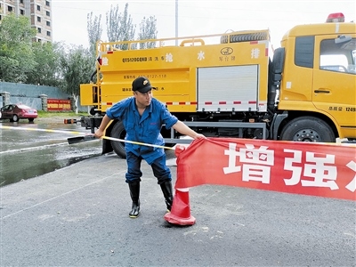 在這之前,通遼市排水管理處已啟動應急預案,搶險人員及應急搶險車輛陸續(xù)就位。負責明仁立交橋排水搶險的第2小組的4名成員兵分兩路,需要勸退東、西兩側準備過橋的汽車司機和行人,以及排布車輛、施拉警界線……橋西邊,污水管道維護隊車隊隊長張再智邊忙著手里的活兒,邊通過對講機呼叫副隊長盛博,催促他趕緊向過往的車輛及行人喊話,提醒大家橋下水深不能通行。此時,盛博已駕車由西向東行至立交橋南側的輔路上,雨水遮住了視線,雨刮器速度越來越快,他邊回應張再智,邊放慢車速向人們喊話。