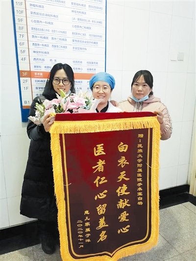 11月27日,當(dāng)孩子已經(jīng)好轉(zhuǎn)出院,王欣影沒有忘記那一夜遇到的好心人,她再一次撥通白楊的電話,此時,她才得知白楊就是附屬醫(yī)院手術(shù)室的一名護(hù)士。她將一面寫有“白衣天使獻(xiàn)愛心醫(yī)者仁心留美名”的錦旗送到了白楊的手中,她說:女兒又多了一位媽媽。白楊也向記者講起了那晚的經(jīng)歷,她說:“其實,那晚我是去接我丈夫的,由于暴雪,丈夫被困在了米家科技園附近,我開車去接他,在回來的路上,看到有車輛遇險,心想,這樣惡劣的天氣,遇到誰有困難就應(yīng)該幫一把,當(dāng)時,我們也沒有多想,我也是做母親的,看到夫妻倆那么焦急,我只想把孩子快點送到醫(yī)院,好在有驚無險,孩子平安無事?!焙髞?,記者還了解到,當(dāng)把孩子送到醫(yī)院后,白楊已渾身濕透,待孩子已經(jīng)搶救上,安頓好王欣影后,已經(jīng)是凌晨5點,天也蒙蒙亮了,白楊沒有回家,一夜未眠的她,留在了工作崗位上。