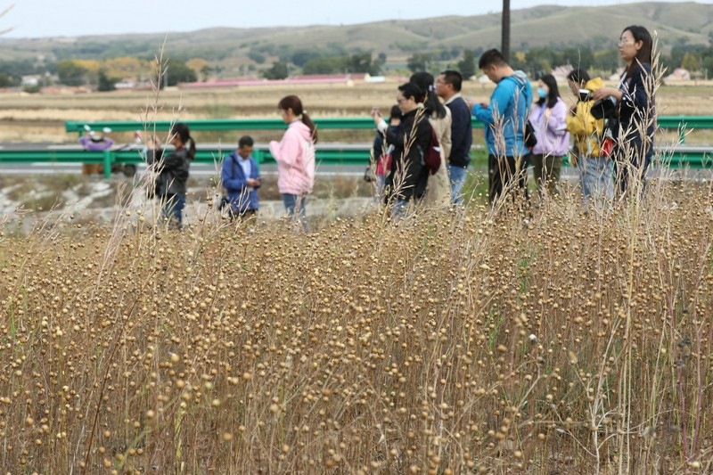 媒體團成員到田間地頭了解亞麻籽種植收獲情況