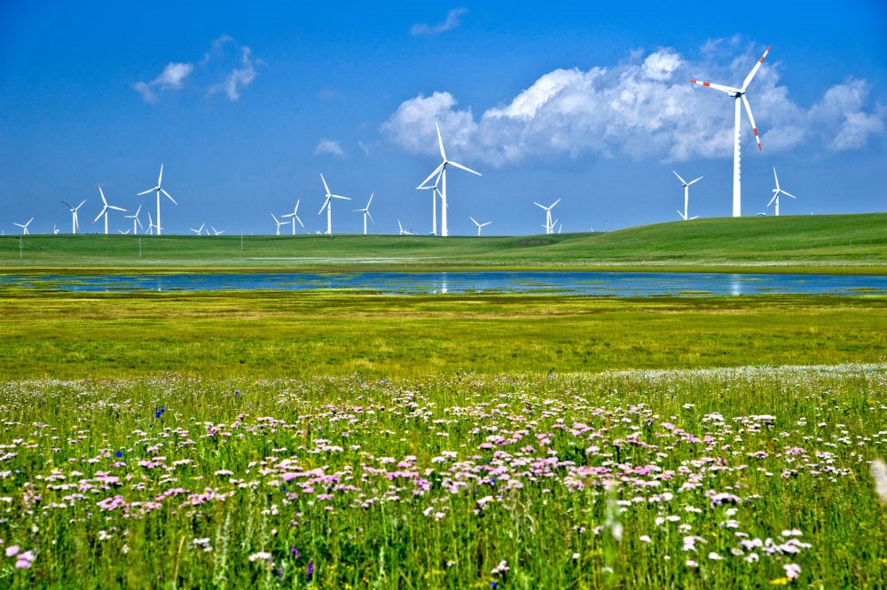 “輝騰錫勒”蒙古語意為“清涼的山崗”,因風(fēng)力資源豐富而得名,是建設(shè)風(fēng)電場(chǎng)理想的場(chǎng)所。如今,一排排風(fēng)電機(jī)猶如“白色森林”,碩大的風(fēng)翼就像一架架“大風(fēng)車”,在草原勁風(fēng)吹動(dòng)下緩緩轉(zhuǎn)動(dòng),形成另一大景觀。
