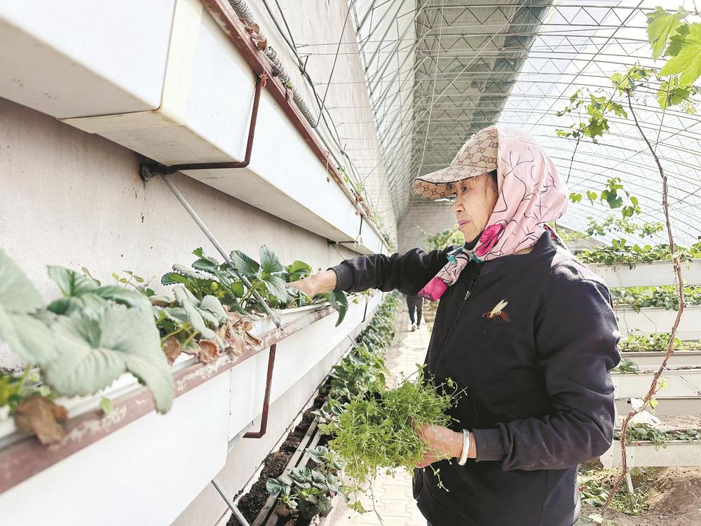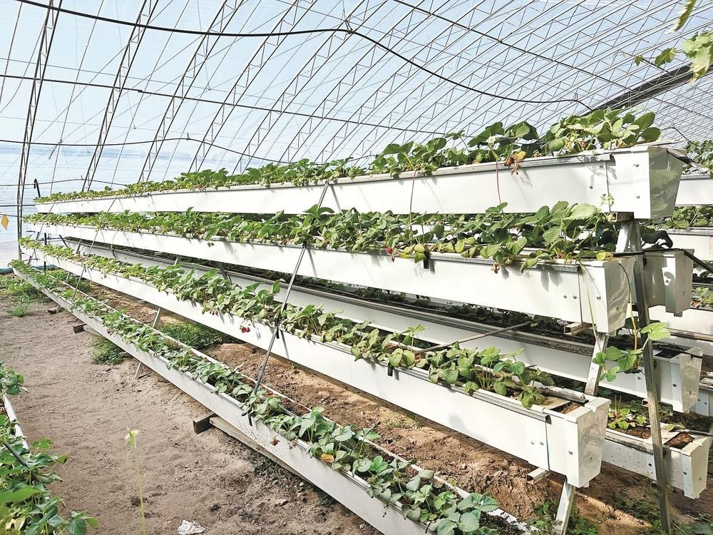 走進(jìn)草莓大棚內(nèi),濃濃的暖意撲面而來。抬眼望去,離地一米多的種植架上種滿了生機(jī)勃勃、長勢(shì)喜人的草莓;穿梭在種植架間,一顆顆鮮紅欲滴、圓潤飽滿的草莓宛如璀璨的紅寶石,從綠葉間“探出頭”來,高高地懸掛在空中,散發(fā)著誘人的清香。種植戶牛尚海正在察看采用立體栽培技術(shù)的草莓長勢(shì)情況。“這是一種三維立體種植方式,能夠充分利用空間和光照,大幅度提高生產(chǎn)效率。以前一畝地最多種8000株,現(xiàn)在能種2.4萬株,產(chǎn)量提高了3倍,而且草莓個(gè)頭更均勻,賣相更好?!迸I泻8嬖V記者,這種種植方式不僅省工、省力,還降低了勞動(dòng)強(qiáng)度,摘草莓也不用彎腰了。此外,這種種植模式比傳統(tǒng)種植模式每畝節(jié)水50%。
