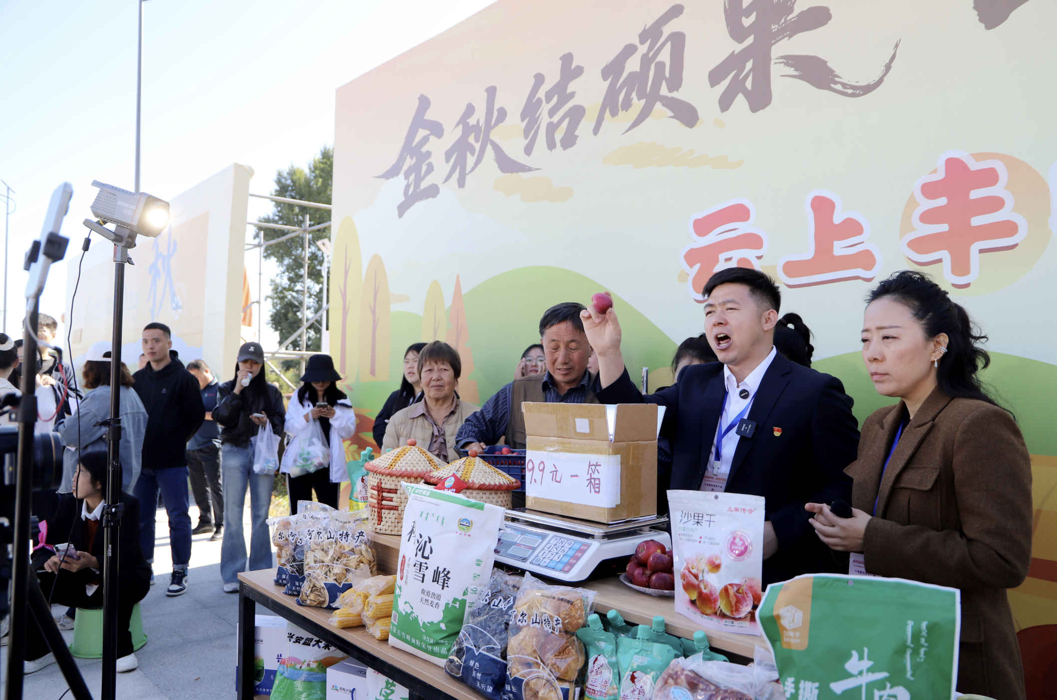 “這都是我們本地的農(nóng)產(chǎn)品,我現(xiàn)在正在豐收節(jié)的現(xiàn)場(chǎng),各位朋友抓緊下單,興安盟產(chǎn)品不會(huì)讓你失望!”活動(dòng)現(xiàn)場(chǎng),烏蘭浩特市義勒力特鎮(zhèn)西包達(dá)力干嘎查駐村干部王曉龍將直播間設(shè)在現(xiàn)場(chǎng),與村民在豐收的熱情氛圍中一起賣(mài)力地推介家鄉(xiāng)好物。