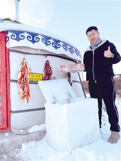 12月8日,記者幾經(jīng)周折與視頻中的小伙張智磊取得了聯(lián)系。張智磊今年36歲,從小在錫林郭勒大草原長大,在當(dāng)?shù)刂饕雠Q蛉馍?。對于意外走紅,張智磊直言自己也沒有想到。“視頻是在錫林浩特市南郊向陽村叔叔家院子里的蒙古包拍攝的。記得小時候,每到冬天,周邊牧民都是把食物埋在雪地里儲存。我前幾天也拍了一個從雪地里找羊腿的視頻,有粉絲留言‘放在雪地里會不會忘記位置容易丟了’,然后我就突發(fā)奇想,干脆做個‘冰箱’把年貨放進去?!睆堉抢诟嬖V記者,他從12月3日開始凍冰塊,12月4日把凍結(jié)實的冰塊拿出來用冷水黏合,因為冰塊低于0攝氏度,遇水就會瞬間黏在一起,然后開始著手打磨,棱棱角角都用電熨斗熨平整,再加上蓋,一個“冰箱”就完成了。