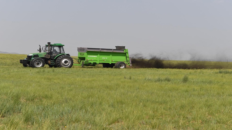 在退化放牧場治理區(qū),施工人員用推土機(jī)推平坑洼不平的風(fēng)蝕坑、整理?xiàng)壨炼?;按照噴幅?~8米的行距,用拋肥機(jī)將牛羊固態(tài)糞肥和含有氮、磷、鉀等生物有機(jī)液態(tài)肥拋灑在草場上,增加土壤肥力;用切根機(jī)將稀疏的羊草切開、促進(jìn)分蘗繁殖、復(fù)壯,增加種群密度;采用栽設(shè)4×4米網(wǎng)格狀沙幛、覆蓋草簾來降溫保墑抗旱保苗,與此同時(shí)與項(xiàng)目區(qū)牧戶簽訂三年的禁牧、生態(tài)補(bǔ)償、管護(hù)協(xié)議。