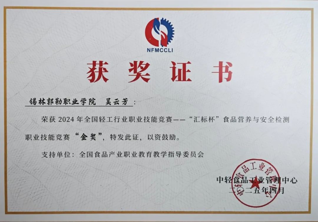 2025年4月21日,由中國輕工業(yè)聯(lián)合會、中輕食品工業(yè)管理中心、全國食品產(chǎn)業(yè)職業(yè)教育教學(xué)指導(dǎo)委員會等聯(lián)合舉辦的2024年全國輕工行業(yè)職業(yè)技能競賽——“匯標(biāo)杯”食品營養(yǎng)與安全檢測職業(yè)技能競賽總決賽在廣州圓滿落幕。錫林郭勒職業(yè)學(xué)院食品檢測中心總工程師吳云芳同志榮獲金獎?! ?/p>