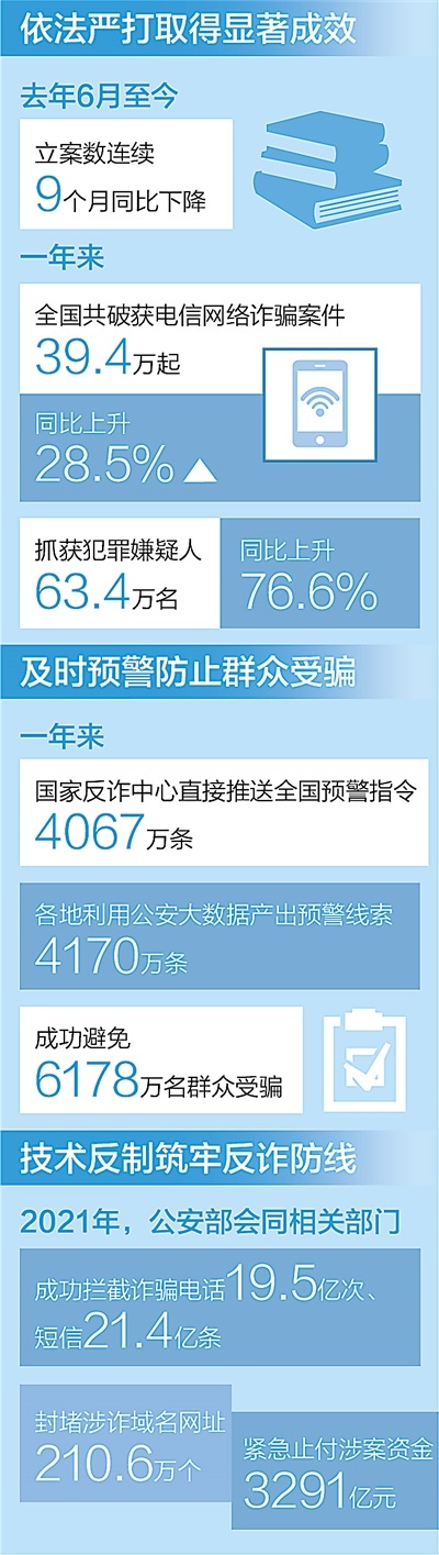 據(jù)介紹,全國公安機關深入開展“云劍”“長城”“斷卡”“斷流”“5·10”等專項行動,先后組織開展150次全國集群戰(zhàn)役。一年來,共破獲電信網(wǎng)絡詐騙案件39.4萬起,抓獲犯罪嫌疑人63.4萬名,同比分別上升28.5%和76.6%。根據(jù)最新統(tǒng)計,電信網(wǎng)絡詐騙立案數(shù)連續(xù)9個月同比下降,打擊治理工作取得顯著成效。