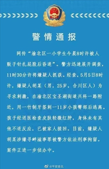 ·重慶警方通報(bào)“渝北一學(xué)生被人販子針扎后昏迷”:嫌疑人被依法刑事拘留。