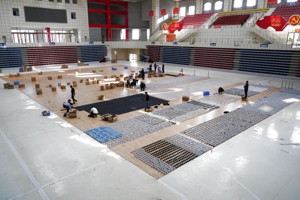 民警在黑龍江省饒河縣一體育館內(nèi)清點(diǎn)繳獲的竊聽竊照器材。(饒河縣公安局供圖)