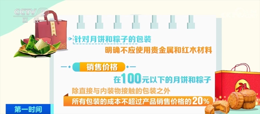 針對月餅和粽子的包裝,明確不應(yīng)使用貴金屬和紅木材料;銷售價格在100元以下的月餅和粽子,除直接與內(nèi)裝物接觸的包裝之外,所有包裝的成本不超過產(chǎn)品銷售價格的20%;售價在100元以上的,包裝成本不超過產(chǎn)品銷售價格的15%。