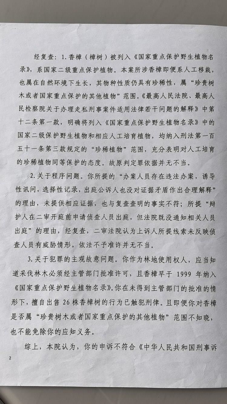 “都是人工種植的香樟樹(shù),瀘州中院為何在此案件中就認(rèn)定為國(guó)家重點(diǎn)保護(hù)植物,在同類其他案件中就不認(rèn)定呢?”12月26日下午,馬萬(wàn)春告訴上游新聞?dòng)浾?,他在此前一審二審?dān)任哥哥的辯護(hù)人時(shí),搜集了許多案例試圖證明哥哥無(wú)罪,但他明顯感到自己的辯護(hù)意見(jiàn)沒(méi)有獲得法官認(rèn)同。更讓他無(wú)法理解的是:同一家法院在四年不到的時(shí)間里,針對(duì)類似案件,判決結(jié)果竟然差距巨大。