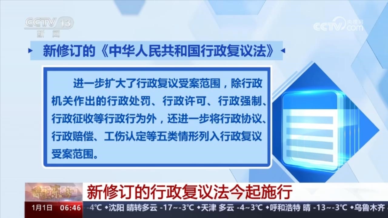 新修訂《中華人民共和國行政復(fù)議法》1月1日起施行,法律進(jìn)一步擴(kuò)大了行政復(fù)議受案范圍,除行政機(jī)關(guān)作出的行政處罰、行政許可、行政強(qiáng)制、行政征收等行政行為外,還進(jìn)一步將行政協(xié)議、行政賠償、工傷認(rèn)定等五類情形列入行政復(fù)議受案范圍。