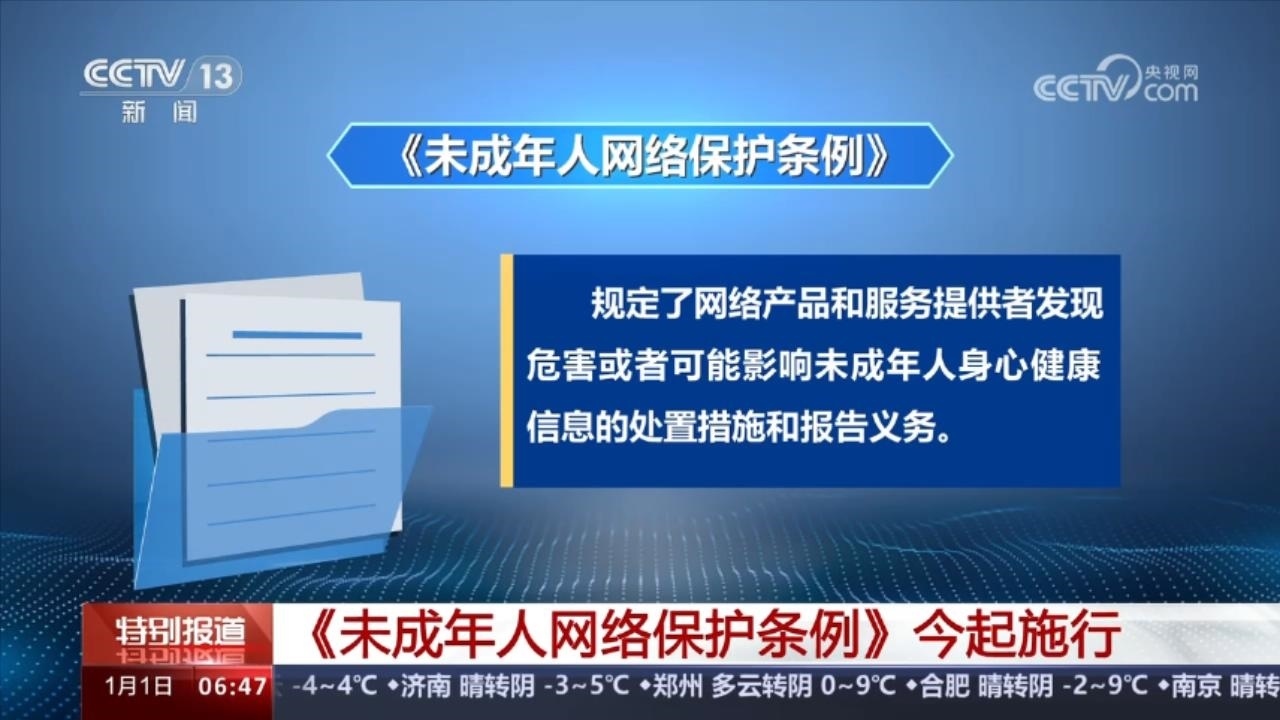 1月1日起施行的《未成年人網(wǎng)絡(luò)保護(hù)條例》是我國第一部專門性的未成年人網(wǎng)絡(luò)保護(hù)綜合立法。條例規(guī)定,網(wǎng)絡(luò)產(chǎn)品和服務(wù)提供者發(fā)現(xiàn)危害或者可能影響未成年人身心健康信息的處置措施和報告義務(wù)。