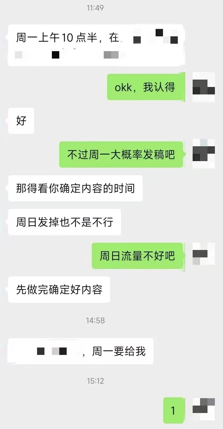 “周日流量不好吧?”她內(nèi)心氣不過,表面上卻只能迂回地勸對方改個(gè)主意。此時(shí)已經(jīng)是周五下午,距離原定的下班時(shí)間只剩下3個(gè)小時(shí)。但對方?jīng)]有理會(huì),繼續(xù)發(fā)來消息:“先做完確定好內(nèi)容。”