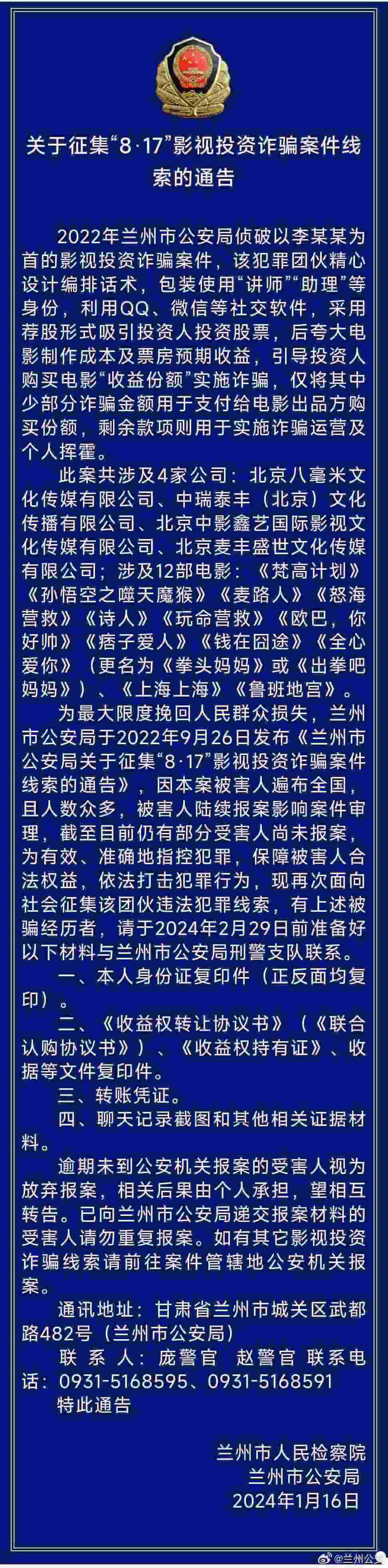 為最大限度挽回人民群眾損失,蘭州市公安局早在2022年9月26日發(fā)布《蘭州市公安局關于征集“8·17”影視投資詐騙案件線索的通告》,但因本案被害人遍布全國,且人數(shù)眾多,受害人陸續(xù)報案影響案件審理,截至目前仍有部分受害人尚未報案。
