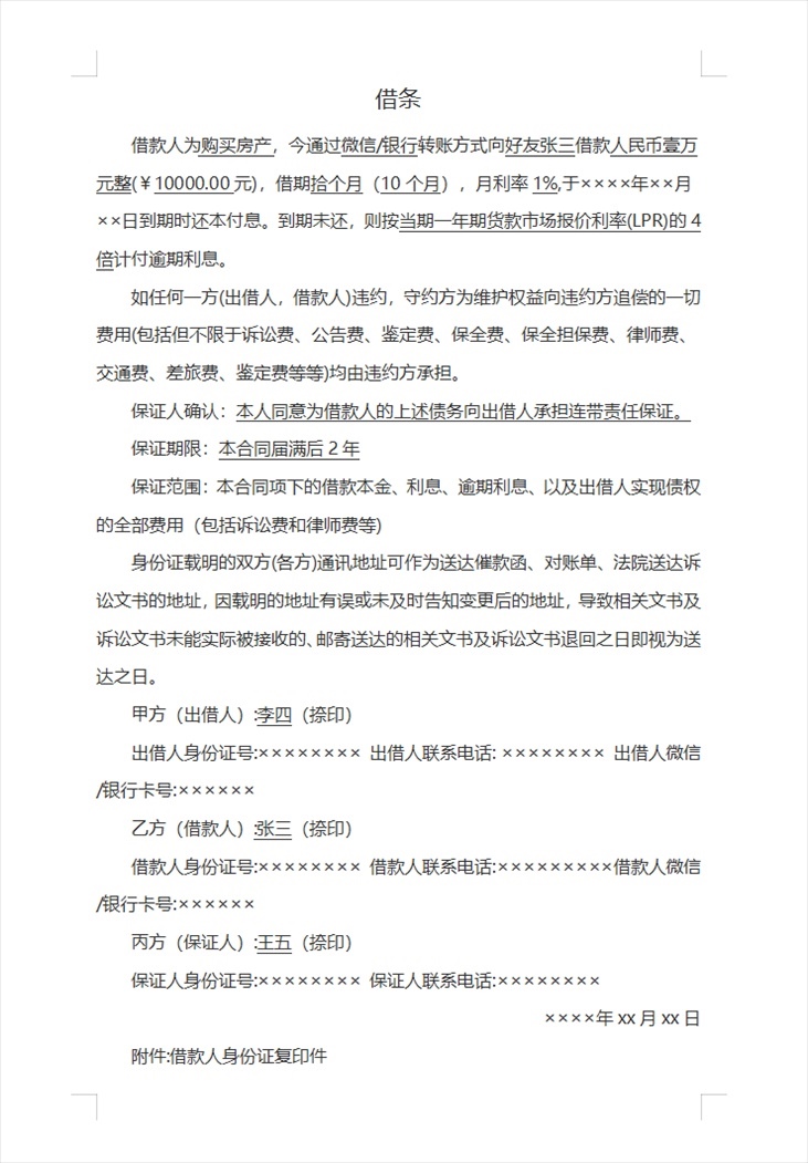 · 借款人:借款人應(yīng)當(dāng)在借條中簽名、捺印并附上身份證號(hào)碼。