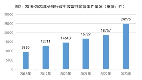 1.依申請(qǐng)監(jiān)督的行政生效裁判監(jiān)督案件數(shù)量逐年上升,反映出人民群眾對(duì)檢察監(jiān)督的更高需求。2018年以來當(dāng)事人不服法院生效裁判向檢察機(jī)關(guān)申請(qǐng)監(jiān)督的案件分別是:2018年8697件、2019年11643件、2020年12933件、2021年14995件、2022年17186件、2023年22602件,年均增加21%。2023年16個(gè)省級(jí)檢察院受理行政案件數(shù)超過民事案件。當(dāng)事人對(duì)裁判結(jié)果申請(qǐng)監(jiān)督的同時(shí),很多情況下還對(duì)審判和執(zhí)行程序一并主張?jiān)V求,追求“看得見”的公平正義。