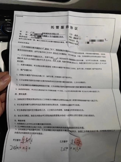 趙永開(kāi)車來(lái)到位于廣東省佛山市的“車管部門”辦理“托管”手續(xù)。托管協(xié)議顯示,車輛由廣東智富卓越新能源科技有限公司托管處理,公司每月給趙永支付租金3000余元。
