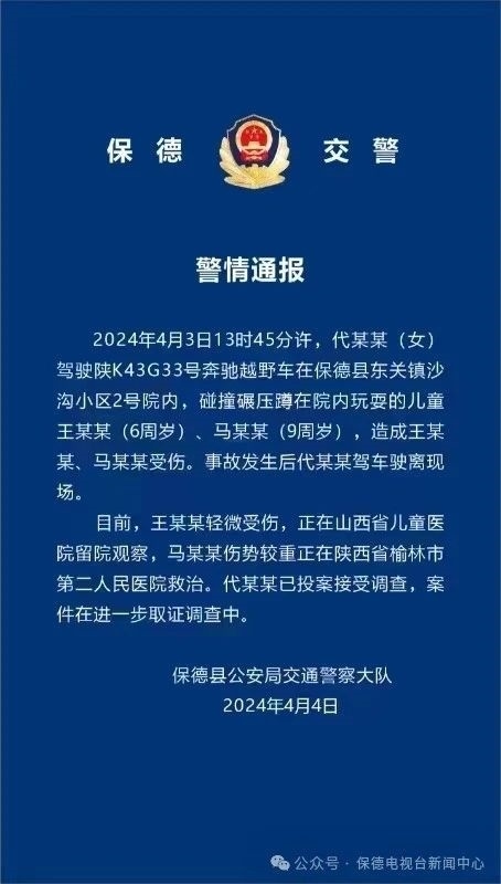 央視網(wǎng)消息:據(jù)保德縣融媒體中心消息,4月4日,保德縣公安局交通警察大隊發(fā)布警情通報:2024年4月3日13時45分許,代某某(女)駕駛陜K43G33號奔馳越野車在保德縣東關(guān)鎮(zhèn)沙溝小區(qū)2號院內(nèi),碰撞碾壓蹲在院內(nèi)玩耍的兒童王某某(6周歲)、馬某某(9周歲),造成王某某、馬某某受傷。事故發(fā)生后代某某駕車駛離現(xiàn)場。
