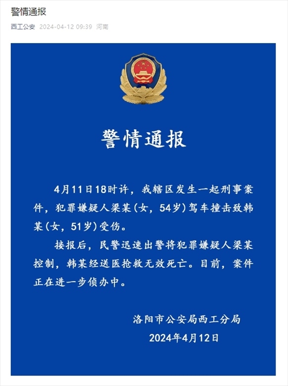央視網(wǎng)消息:洛陽市公安局西工分局4月12日通報,4月11日18時許,該轄區(qū)發(fā)生一起刑事案件,犯罪嫌疑人梁某(女,54歲)駕車撞擊致韓某(女,51歲)受傷。接報后,民警迅速出警將犯罪嫌疑人梁某控制,韓某經(jīng)送醫(yī)搶救無效死亡。目前,案件正在進(jìn)一步偵辦中。