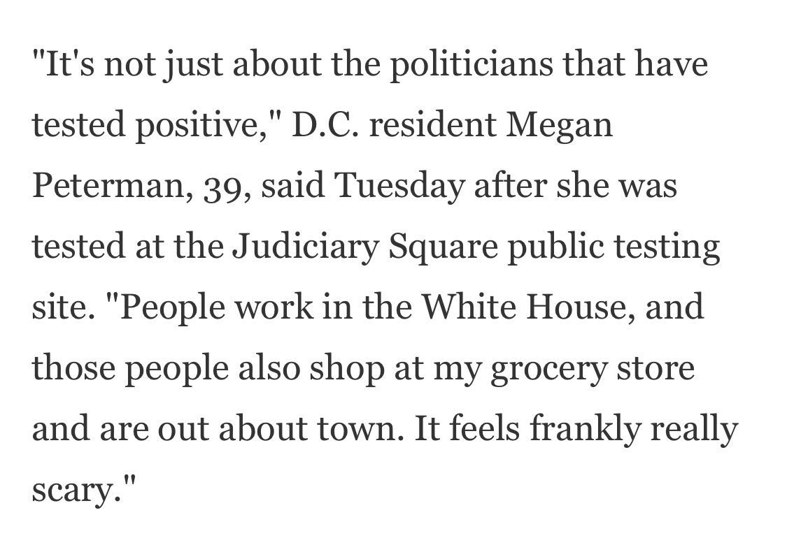 華盛頓居民梅根·彼得曼在當(dāng)?shù)貢r(shí)間6日做了核酸檢測(cè),她說:“最近許多白宮官員確診新冠肺炎,白宮工作人員也可能來過我的商店購(gòu)物,說實(shí)話挺嚇人的。”