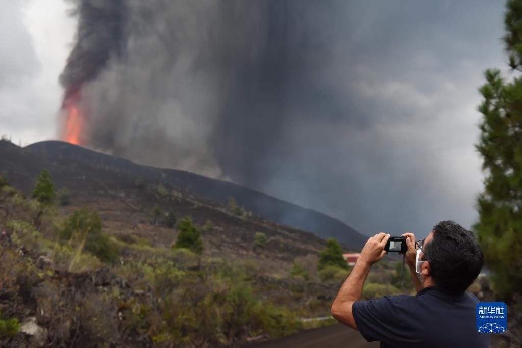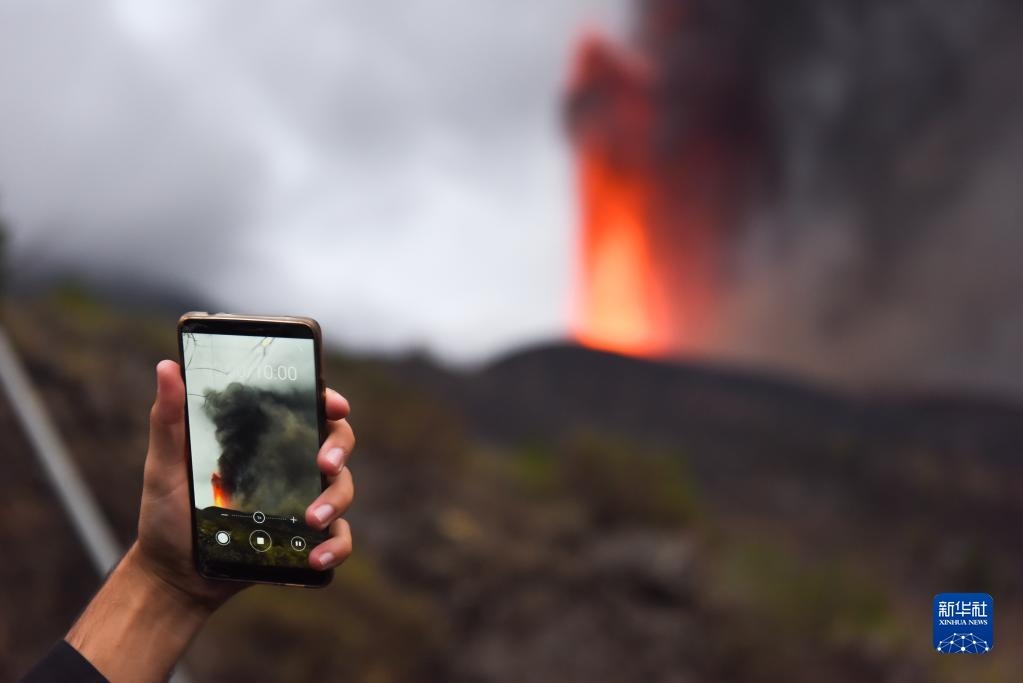 9月22日,一名男子在西班牙拉帕爾馬島拍攝老昆布雷火山噴發(fā)。