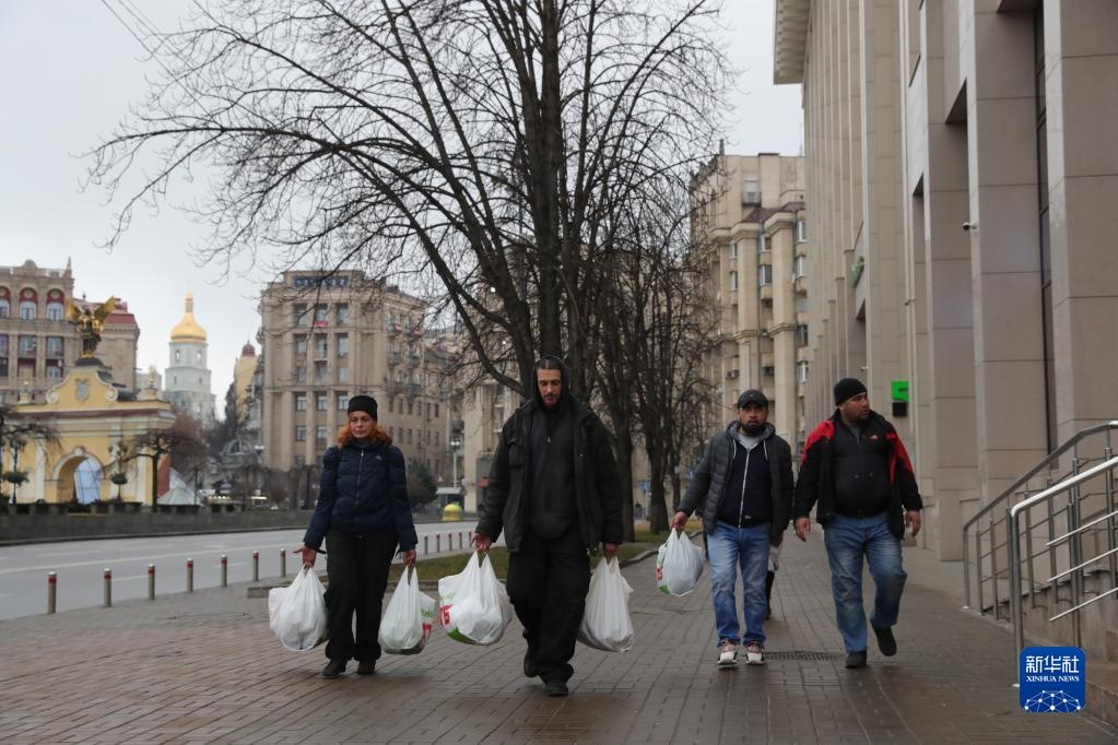 2月24日,在烏克蘭基輔,當(dāng)?shù)鼐用窳嘀少?gòu)的物資走在街道上。新華社記者 李東旭 攝