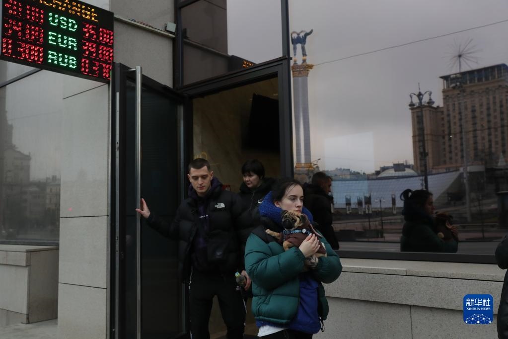 2月24日,在烏克蘭基輔,當(dāng)?shù)鼐用駨囊惶帗Q匯點(diǎn)離開(kāi)。新華社記者 李東旭 攝