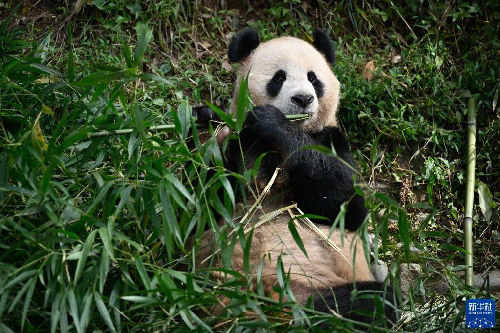 10月17日,在中國(guó)大熊貓保護(hù)研究中心雅安基地,大熊貓“四?!痹诔灾褡?。新華社發(fā)(陳居偉 攝)