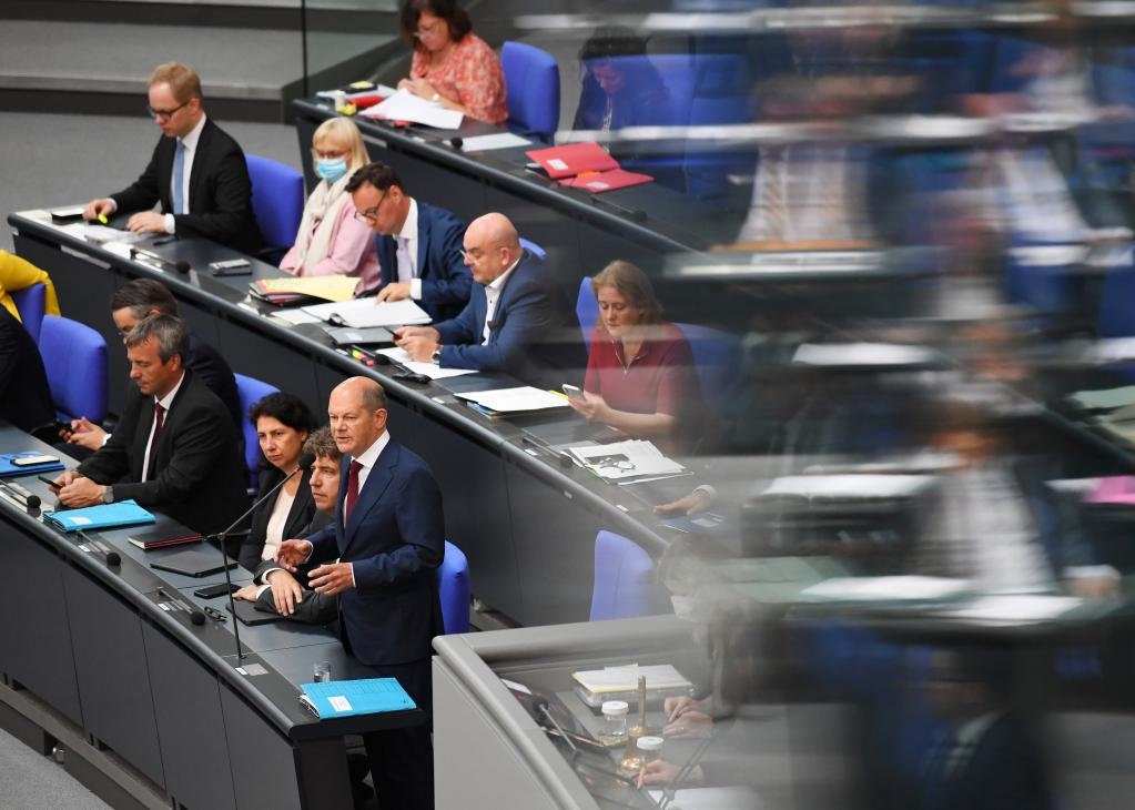 7月6日,德國總理朔爾茨(前右一)在位于柏林的德國聯(lián)邦議會接受例行問詢。新華社記者任鵬飛攝