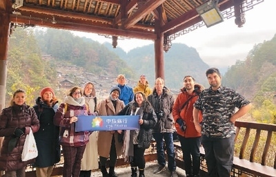 貴州省凱里市的郎德上寨被譽(yù)為“中國(guó)景觀村落”,圖為在華外國(guó)人到此游覽。 中旅旅行供圖