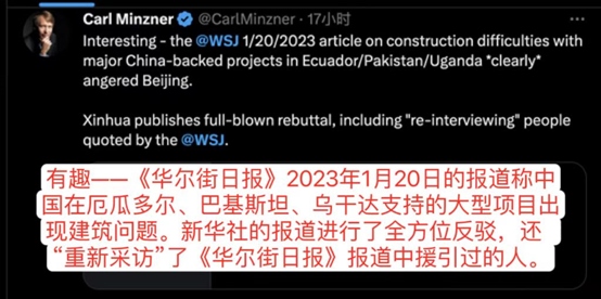 美國福特漢姆大學(xué)教授、美國外交關(guān)系協(xié)會中國問題高級研究員明克勝轉(zhuǎn)發(fā)了新華社的報(bào)道,并稱:有趣——《華爾街日報(bào)》2023年1月20日的報(bào)道稱中國在厄瓜多爾、巴基斯坦、烏干達(dá)支持的大型項(xiàng)目出現(xiàn)建筑問題。新華社的報(bào)道進(jìn)行了全方位反駁,還“重新采訪”了《華爾街日報(bào)》報(bào)道中援引過的人。